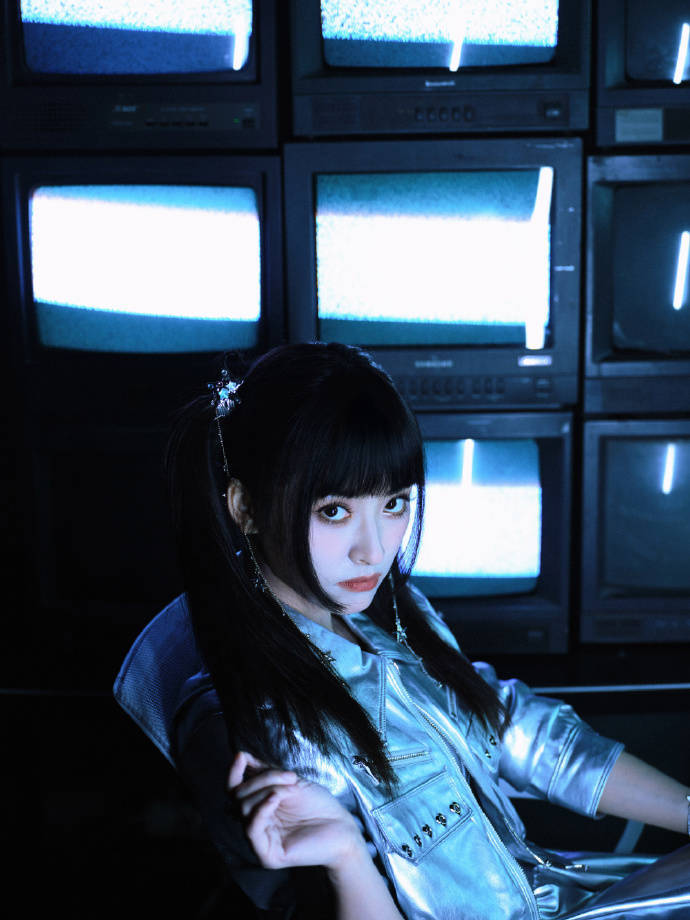 造型师张振这次是把“未来复古主义”玩明白了。日式二次元的双马尾被剪出利落刀裁般的发尾,挑染的银灰色发丝藏在黑色长发里,一动一静间全是机械感。最绝的是那套银色连体装,反光材质像流动的液态金属,肩膀处的几何切割设计直接把“机甲风”焊在了身上。舞台上雪花屏特效亮起时,沈月站在科技光阵中央,冷着脸甩动双马尾的样子,活脱脱就是网友说的“掌控开关的仿生人造物主”。